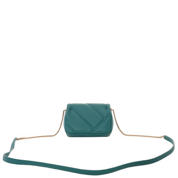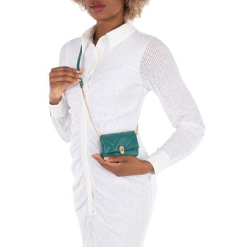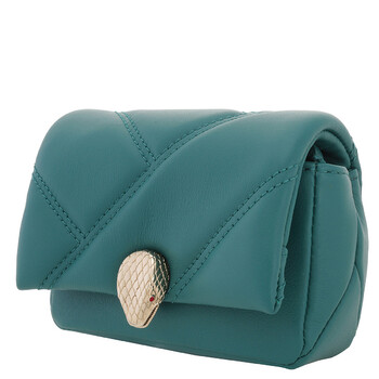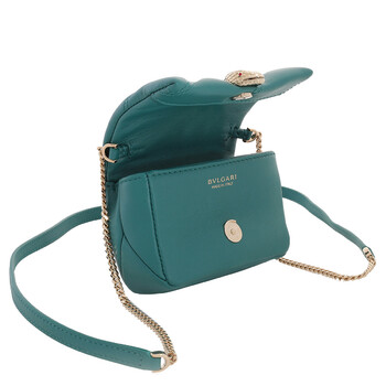 Bvlgari Ladies Mini Bag. Serpenti Cabochon series. SKU: 292561. Color: Green. Size: 4.3 x 3.5 x 1.6". Bvlgari Serpenti Cabochon Micro Leather Bag. The micro bag, crafted from jade-green maxi matelasse calf leather with a violet-amethyst nappa leather on the inside, features a heritage magnetic snakehead closure, a leather and chain strap, a flap closure, and a credit card pocket. Material: Calf leather. Made in Italy.