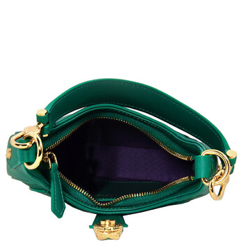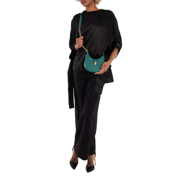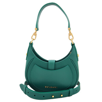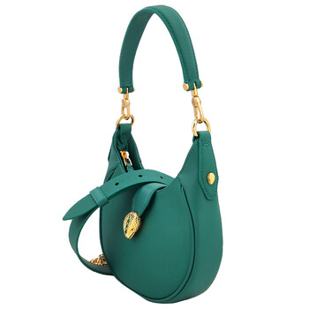 Bvlgari Ladies Hobo. SKU: 292582. Color: Green. Size: 19.5 x 20 x 4.5 cm. The Serpenti Ellipse small crossbody bag combines signature details and a unique shape, crafted from bright green urban grained calfskin, with a gem-encrusted magnetic snakehead closure inspired by a 1960s Bvlgari watch, featuring a chain and leather strap, leather handles, a top zipper, an internal pocket, an external back pocket, and a metal Bvlgari logo. 100% Calfskin. Made in Italy.
