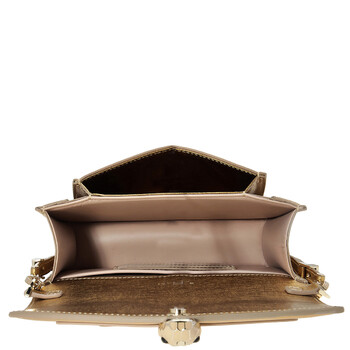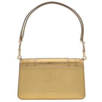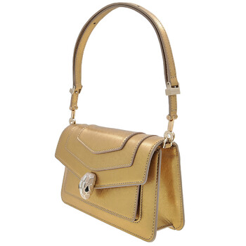 Bvlgari Ladies Shoulder Bag. Serpenti Forever series. SKU: 293642. Color: Gold. Size: 8.7 x 5.1 x 0.7". Bvlgari Serpenti Forever Leather East-West Shoulder Bag. Crafted from calf leather, features a practical leather strap, a magnetic snakehead closure inspired by '60s Serpenti jewels, and includes a single compartment, front and back patch pockets, an internal seam pocket, three card slots, a customisable mirror, and the Bvlgari metal logo, all complemented by light gold-plated brass hardware. Material: Calf leather. Made in Italy.