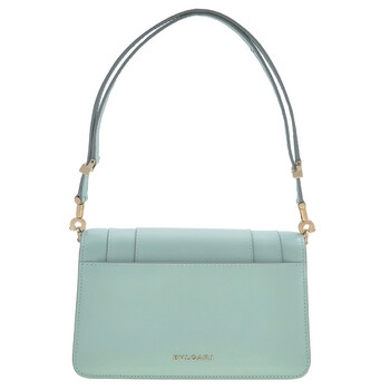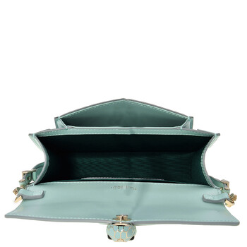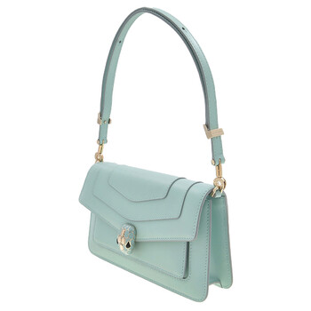 Bvlgari Ladies Shoulder Bag. Serpenti Forever series. SKU: 293634. Color: Light Blue. Size: 8.7 x 5.1 x 0.7". Bvlgari Serpenti Forever Leather East-West Shoulder Bag. Crafted from calf leather, features a practical leather strap, a magnetic snakehead closure inspired by '60s Serpenti jewels, and includes a single compartment, front and back patch pockets, an internal seam pocket, three card slots, a customisable mirror, and the Bvlgari metal logo, all complemented by light gold-plated brass hardware. Material: Calf leather. Made in Italy.