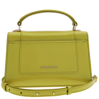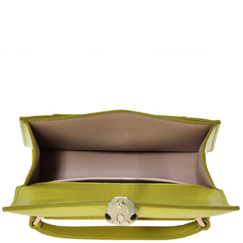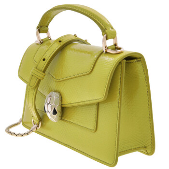 Bvlgari Ladies Top Handle Bag. Serpenti Forever series. SKU: 293751. Color: Green. Size: 7.5 x 4.3 x 2.2". Bvlgari Serpenti Forever Leather Top Handle Bag. This top-handle bag is made from luxurious linden peridot yellowish-green karung skin, featuring a glossy finish, snake-shaped chain and leather strap, and the iconic snakehead magnetic closure. It includes a single compartment, front and back patch pockets, an internal open pocket, a mirror pocket with a customizable mirror, a metal tag with the Bvlgari logo, and light gold-plated brass hardware. Material: Karung leather. Made in Italy.