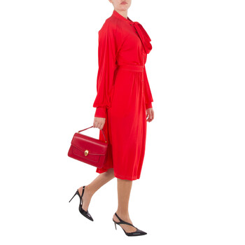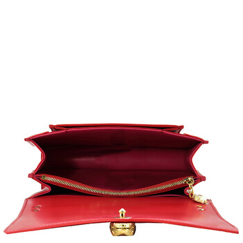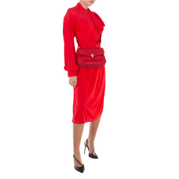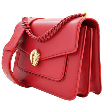 Bvlgari Ladies Crossbody. Serpenti Forever series. SKU: 290766. Color: Red. Size: 25 x 16.5 x 8 cm. Bvlgari Serpenti Forever Red Ladies Crossbody 290766. The Serpenti Forever Crossbody Bag by Bvlgari showcases a modern silhouette with an everyday flair. Crafted in luxurious nappa leather, it features gold-plated brass hardware, including a striking reinterpretation of the iconic Serpenti head closure. A Bvlgari chain adorns the flap, doubling as an elegant handle. The bag offers versatility with two gussets, a detachable and adjustable leather strap, and multiple pockets, including a front pocket, back patch pocket, open pocket, and zipped partition. Material?: Nappa leather. Made in Italy.