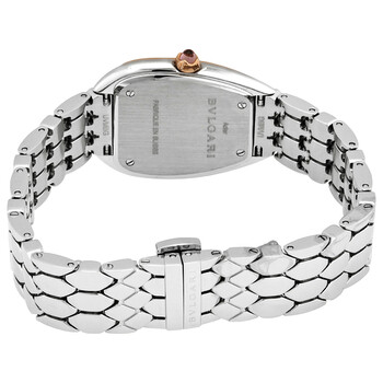 Stainless steel case with a stainless steel bracelet. Fixed 18kt rose gold bezel set with 38 diamonds. White dial with rose gold-tone hands and index hour markers. Roman numerals appear atthe 6 and 12 o'clock positions. Dial Type: Analog. Quartz movement. Scratch resistant sapphire crystal. Pull / push crown set with a pink sapphire cabochon. Solid case back. Unique case shape. Case size: 33 mm. Fold over clasp. Water resistant at 30 meters / 100 feet. Functions: hour, minute. Serpenti Seduttori Series. Watch label: Swiss Made. Bvlgari Serpenti Seduttori Quartz White Dial Ladies Watch 103143.