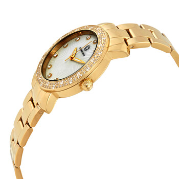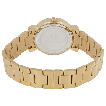 Yellow gold ion-plated stainless steel case and bracelet. Fixed yellow gold ion-plated bezel set with white crystals. White dial with luminous yellow gold-tone hands and crystal hour markers. Minute markers around the outer rim. Dial Type: Analog. Luminescent hands. Miyota caliber 2035 quartz movement. Scratch resistant mineral crystal. Pull / push crown. Screw down case back. Case size: 36 mm. Case thickness: 9 mm. Round case shape. Band width: 18 mm. Band length: 8.5 inches. Hidden fold over clasp. Water resistant at 50 meters / 165 feet. Functions: hour, minute, second. Dress watch style. Watch label: Japan Movt. Cabochon Carmel Crystal Ladies Watch CABOCHON-16604-YG-22.