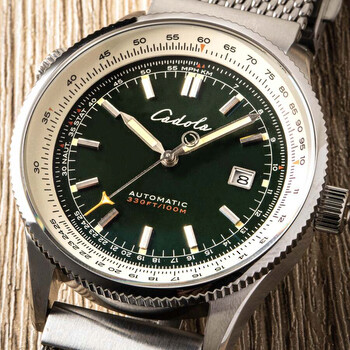 An inner pilot slide rule bezel authenticates the Aviateur as a great aviation tool watch. Powered by a robustly reliable Japanese automatic movement, the watch is a classy piece of wearable timekeeping dipped in an enduring style guaranteed to impress. Silver-tone stainless steel case and bracelet. Uni-directional rotating silver-tone stainless steel bezel. Green dial with silver-tone hands and Arabic numeral & index hour markers. Minute markers around the outer rim. Dial Type: Analog. Date display at the 3 o'clock position. Miyota Caliber 8215 Automatic movement, containing 21 Jewels, bitting at 21600 vph, and has a power reserve of approximately 42 hours. Scratch resistant sapphire crystal. Pull / push crown. Transparent case back. Round case shape, case size: 44 mm, case thickness: 14 mm. Band width: 22 mm, band length: 8 inches. Fold over clasp with a safety release. Water resistant at 100 meters / 330 feet. Functions: date, hour, minute, second. Aviateur Series. Casual watch style. Watch label: Japan Movt. Cadola Aviateur Automatic Green Dial Men's Watch CD-1008-55.