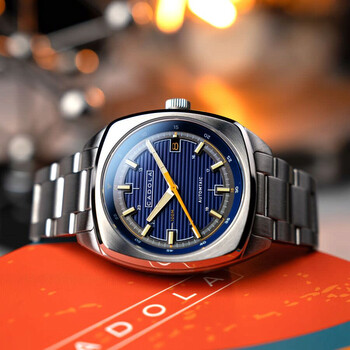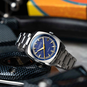 Experience racing of the older days with the Buxton Automatic. With a 38mm stainless steel cushion case, this compact timepiece is powered by a reliable NH35 automatic movement. The colour combinations on the dial originate from classic racing cars, adding a touch of vintage hue to your everyday style. This is a sturdy and stylish timepiece that will surely elevate your timekeeping game. Silver-tone stainless steel case and bracelet. Fixed silver-tone stainless steel bezel. Blue dial with silver-tone hands and index hour markers. Minute markers around the outer rim. Dial Type: Analog. Luminescent hands and markers. Date display at the 3 o'clock position. Seiko - NH35 automatic movement. Scratch resistant mineral crystal. Pull / push crown. Solid case back. Round case shape, case size: 38 mm, case thickness: 13 mm. Band width: 20 mm, band length: 8 inches. Fold over clasp. Water resistant at 100 meters / 330 feet. Functions: date, hour, minute, second. Buxton Series. Casual watch style. Watch label: Japan Movement. Cadola Buxton Automatic Blue Dial Men's Watch CD-1057-44.