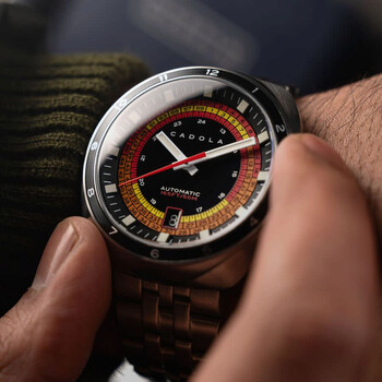 Vibrant with a touch of vintage aesthetics, the Giulia Suprema Automatic pays homage to the exhilarating world of motorsport. The stainless steel cushion case exudes a robust yet refined look. With the reliable TMI NH35 automatic movement, this is the perfect racing companion. Silver-tone stainless steel case and bracelet. Fixed black aluminum bezel. Black dial with silver-tone hands and Arabic numeral & index hour markers. Minute markers around the outer rim. Dial Type: Analog. Luminescent hands and markers. Date display at the 6 o'clock position. Seiko - NH35 automatic movement. Scratch resistant mineral crystal. Pull / push crown. Solid case back. Round case shape, case size: 43 mm, case thickness: 14 mm. Band width: 22 mm, band length: 8 inches. Fold over clasp with a safety release. Water resistant at 50 meters / 165 feet. Functions: date, hour, minute, second. Cosworth Costin Series. Casual watch style. Cadola Cosworth Costin Automatic Black Dial Men's Watch CD-1044-11.