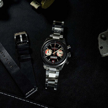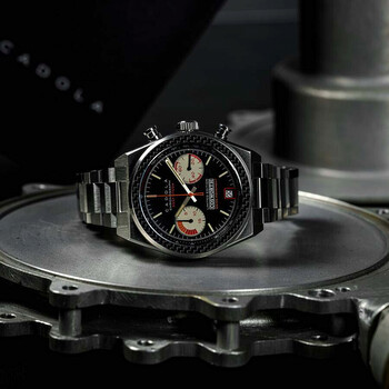A limited-edition timepiece, the Cosworth Costin features the pinpoint precision of a high-specification Swiss chronograph movement enabling split time measurement. Robustly engineered, the Costin comes with carbon fiber bezel detailing, a bold bracelet design, and an additional strap for a degree of added versatility and style. Silver-tone stainless steel case and bracelet. Fixed black stainless steel bezel. Black dial with silver-tone hands and Arabic numeral & index hour markers. Minute markers around the outer rim. Dial Type: Analog. Luminescent hands and markers. Date display at the 6 o'clock position. Chronograph - two sub-dials displaying: 60 second and 30 minute. ISA Caliber 8371 quartz movement. Scratch resistant mineral crystal. Pull / push crown. Solid case back. Round case shape, case size: 42 mm, case thickness: 14 mm. Band width: 20 mm, band length: 8 inches. Fold over clasp with a safety release. Water resistant at 100 meters / 330 feet. Functions: chronograph, date, hour, minute, second. Cosworth Costin Series. Casual watch style. Cadola Cosworth Costin Chronograph Quartz Black Dial Men's Watch CD-1040-11.