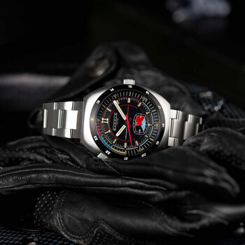A classic vintage silhouette makes this watch a great addition to those who've come to appreciate the time-honoured style and sophistication of mid-century motorsport-inspired timekeeping. The Seiko VH60 movement features precise accuracy, high durability, and a unique 24-hour hand, making it perfect for any collector or enthusiast. Silver-tone stainless steel case and bracelet. Fixed black stainless steel bezel. Black dial with silver-tone hands and Arabic numeral & index hour markers. Minute markers around the outer rim. Dial Type: Analog. Seiko - VH60 quartz movement. Scratch resistant mineral crystal. Pull / push crown. Solid case back. Oval case shape, case size: 42 mm, case thickness: 12 mm. Band width: 20 mm, band length: 8 inches. Fold over clasp with a safety release. Water resistant at 100 meters / 330 feet. Functions: hour, minute, second. Giulia Series. Casual watch style. Cadola Giulia Quartz Black Dial Men's Watch CD-1052-11.