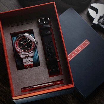 With style, substance, and bold motorsport spirit, this watch perfectly captures the wants and needs of the motorsports professional. High-quality mechanics are housed in a robustly enduring build of solid steel for a timepiece built and designed to perform. Silver-tone stainless steel case and bracelet. Fixed silver-tone stainless steel bezel. Black dial with black hands and Arabic numeral & index hour markers. Minute markers around the outer rim. Dial Type: Analog. Luminescent hands and markers. Date display at the 3 o'clock position. Seiko - NH35 automatic movement. Scratch resistant mineral crystal. Pull / push crown. Solid case back. Round case shape, case size: 43 mm, case thickness: 13 mm. Band width: 20 mm, band length: 8 inches. Fold over clasp with a safety release. Water resistant at 100 meters / 330 feet. Functions: date, hour, minute, second. Pista Series. Casual watch style. Cadola Pista Automatic Black Dial Men's Watch CD-1031-22.