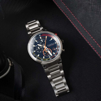 This racing-inspired timepiece is designed for speed, featuring an aerodynamic case that combines robust engineering with a sleek profile. Powered by the impressive hybrid VK series TMI Japan Meca-quartz chronograph movement, it delivers exceptional performance. The watch includes an additional custom molded polyurethane strap for added versatility, alongside its solid stainless steel bracelet. Silver-tone stainless steel case and bracelet. Fixed silver-tone stainless steel bezel. Blue dial with silver-tone hands and Arabic numeral & index hour markers. Minute markers around the outer rim. Dial Type: Analog. Luminescent hands and markers. Date display at the 4 o'clock position. Seiko - VK67 quartz movement. Scratch resistant mineral crystal. Pull / push crown. Solid case back. Round case shape, case size: 44 mm, case thickness: 13 mm. Band width: 24 mm, band length: 8 inches. Fold over clasp with a safety release. Water resistant at 100 meters / 330 feet. Functions: chronograph, date, hour, minute, second. Surtees Series. Casual watch style. Cadola Surtees Chronograph Quartz Blue Dial Men's Watch CD-1028-22.