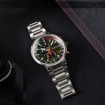 This racing-inspired timepiece is designed for speed, featuring an aerodynamic case that combines robust engineering with a sleek profile. Powered by the impressive hybrid VK series TMI Japan Meca-quartz chronograph movement, it delivers exceptional performance. The watch includes an additional custom molded polyurethane strap for added versatility, alongside its solid stainless steel bracelet. Silver-tone stainless steel case and bracelet. Fixed silver-tone stainless steel bezel. Green dial with silver-tone hands and Arabic numeral & index hour markers. Minute markers around the outer rim. Dial Type: Analog. Luminescent hands and markers. Date display at the 4 o'clock position. Seiko - VK67 quartz movement. Scratch resistant mineral crystal. Pull / push crown. Solid case back. Round case shape, case size: 44 mm, case thickness: 13 mm. Band width: 24 mm, band length: 8 inches. Fold over clasp with a safety release. Water resistant at 100 meters / 330 feet. Functions: chronograph, date, hour, minute, second. Surtees Series. Casual watch style. Cadola Surtees Chronograph Quartz Green Dial Men's Watch CD-1028-44.