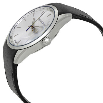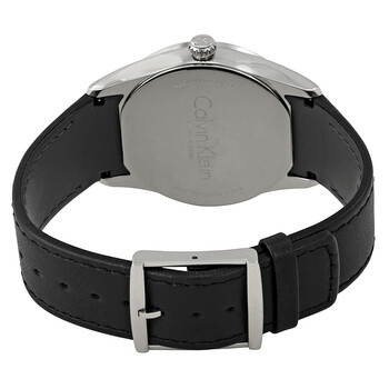 Stainless steel case with a black leather strap. Fixed stainless steel bezel. White dial with luminous silver-tone hands and index hour markers. Minute markers around the outer rim. Dial Type: Analog. Quartz movement. Scratch resistant mineral crystal. Pull / push crown. Solid case back. Case size: 41 mm. Case thickness: 11 mm. Round case shape. Band width: 20 mm. Band length: 8 inches. Tang clasp. Water resistant at 50 meters / 165 feet. Functions: hour, minute, second. Casual watch style. Watch label: Swiss Made. Calvin Klein Bold White Dial Black Leather Men's Watch K5A311C6.