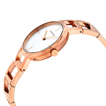 Rose gold PVD stainless steel case with a rose gold PVD stainless steel bangle bracelet. Fixed rose gold PVD bezel. Silver dial with rose gold-tone hands and index hour markers. Index markers at the 3, 6, 9 and 12 o'clock positions. Dial Type: Analog. Quartz movement. Scratch resistant mineral crystal. Pull / push crown. Solid case back. Round case shape. Case size: 32 mm. Case thickness: 7 mm. Band width: 16 mm. Fold over clasp. Water resistant at 30 meters / 100 feet. Functions: hour, minute. Dress watch style. Watch label: Swiss Made. Calvin Klein Cheers Silver Dial Rose Gold PVD Ladies Watch K8N23646.