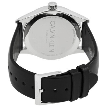Silver-tone stainless steel case with a black leather strap. Fixed silver-tone stainless steel bezel. Silver dial with silver-tone hands and Arabic numeral / index hour markers. Minute markers around the outer rim. Dial Type: Analog. Luminescent hands and markers. Date display at the 3 o'clock position. ETA Caliber F07.111 quartz movement. Scratch resistant sapphire crystal. Pull / push crown. Solid case back. Round case shape, case size: 43 mm, case thickness: 7.5 mm. Band width: 20 mm. Tang clasp. Water resistant at 30 meters / 100 feet. Functions: date, hour, minute, second. Completion Series. Casual watch style. Watch label: Swiss Movt. Calvin Klein Completion Quartz Silver Dial Men's Watch KAM211CY.