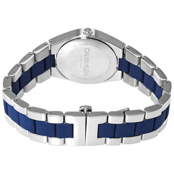Stainless steel case with a stainless steel bracelet with a blue silicone center. Fixed stainless steel bezel. Silver (blue stripe) dial with silver-tone hands and index hour markers. Dial Type: Analog. Date display at the 3 o'clock position. Caliber ETA F05.111 quartz movement. Scratch resistant mineral crystal. Pull / push crown. Solid case back. Round case shape. Case size: 34 mm. Case thickness: 7 mm. Deployment clasp. Water resistant at 30 meters / 100 feet. Functions: date, hour, minute, second. Contrast Series. Casual watch style. Watch label: Swiss Made. Calvin Klein Contrast Quartz Ladies Watch K9E231VX.
