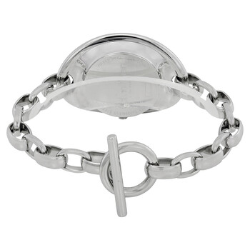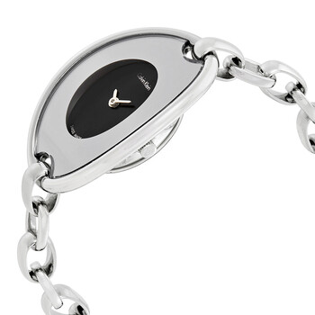 Stainless steel case with a stainless steel chain bracelet. Fixed stainless steel bezel. Black dial with silver-tone hands. No markers. Dial Type: Analog. Quartz movement. Scratch resistant mineral crystal. Pull / push crown. Solid case back. Round case shape. Case size: 29 mm. Case thickness: 8 mm. Band width: 8 mm. Band length: 6 inches. Jewelry clasp. Water resistant at 30 meters / 100 feet. Functions: hour, minute. Casual watch style. Watch label: Swiss Made. Calvin Klein Distinctive Black Dial Ladies Watch K3H23121.