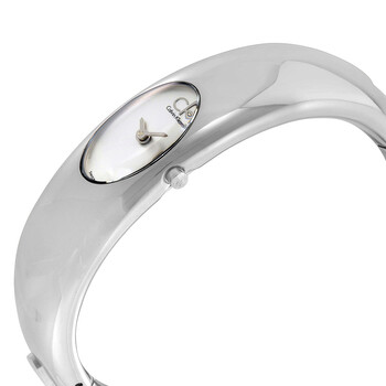 Stainless steel case with a stainless steel bangle bracelet. Fixed stainless steel bezel. White dial with silver-tone hands. No markers. Dial Type: Analog. Quartz movement. Scratch resistant mineral crystal. Pull / push crown. Solid case back. Round case shape. Case size: 18 mm. Case thickness: 9 mm. Band width: 18 mm. Band length: 6 inches. Jewelry clasp. Water resistant at 30 meters / 100 feet. Functions: hour, minute. Dress watch style. Watch label: Swiss Made. Calvin Klein Exquisite White Dial Ladies Watch K1Y23120.