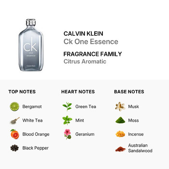 Opening with a bright burst of bergamot, white tea, blood orange, and a hint of black pepper, Ck One Essence instantly awakens the senses. At its heart, refreshing green tea and mint meet with soft geranium, creating a balanced middle that’s both soothing and energizing. The scent finishes with a smooth and grounding base of musk, moss, incense, and rich Australian sandalwood, leaving a lasting impression that’s as unique as you are.