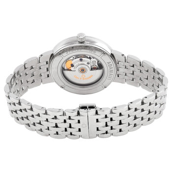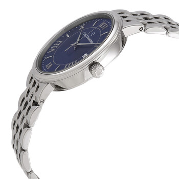 Silver-tone stainless steel case and bracelet. Fixed silver-tone bezel. Blue dial with silver-tone hands and Roman numeral/index hour markers. Dial Type: Analog. Date display at the 3 o'clock position. Carl F. Bucherer Calibre CFB 1950 Automatic movement, containing 26 Jewels, bitting at 28800 vph, and has a power reserve of approximately 38 hours. Scratch resistant sapphire crystal. Round case shape, case size: 39 mm. Folding clasp. Water resistant at 30 meters / 100 feet. Functions: date, hour, minute, second. Adamavi Series. Luxury watch style. Watch label: Swiss Made. Carl F. Bucherer Adamavi Automatic Blue Dial Watch 00.10314.08.55.21.