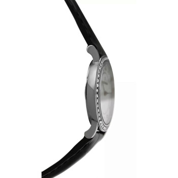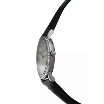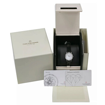 18kt white gold case with a black leather strap. Fixed bezel with diamond set 18kt white gold. Mother of pearl dial with silver-tone hands and diamond hour markers. Dial Type: Analog. Quartz movement. Solid case back. Round case shape, case size: 26 mm. Band length: 6.75 inches. Functions: hour, minute. Adamavi Series. Luxury watch style. Watch label: Swiss Made. Item Variations: 00.10308.02.79.99, 10308.02.79. Carl F. Bucherer Adamavi Quartz Diamond Ladies Watch 10308.02.