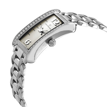 Stainless steel case with a stainless steel bracelet. Fixed stainless steel bezel set with diamonds. Beige dial with silver-tone skeleton hands and index hour markers. Arabic numerals mark the 6 and 12 o'clock positions. Dial Type: Analog. Carl F. Bucherer calibre CFB 1850 quartz movement. Scratch resistant sapphire crystal. Pull / push crown. Solid case back. Unique case shape. Case dimensions: 38 mm x 26.5 mm. Case thickness: 7.4 mm. Fold over clasp. Water resistant at 30 meters / 100 feet. Functions: hour, minute. Alacria Series. Luxury watch style. Watch label: Swiss Made. Item Variations: 366.336.1. Carl F. Bucherer Alacria Ladies Watch 00.10701.08.16.31.