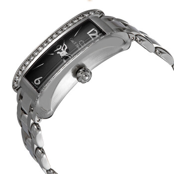 Stainless steel case with a stainless steel bracelet. Fixed stainless steel bezel set with diamonds. Black dial with silver-tone sleleton hands and index hour markers. Arabic numerals appear at the 3, 6, 9 and 12 o'clock positions. Dial Type: Analog. Quartz movement. Scratch resistant sapphire crystal. Pull / push crown. Solid case back. Unique case shape. Case dimensions: 38 mm x 26 mm. Case thickness: 7.4 mm. Band width: 17 mm. Fold over clasp with a push button release. Water resistant at 30 meters / 100 feet. Functions: hour, minute. Alacria Midi Series. Luxury watch style. Watch label: Swiss Made. Item Variations: 366.339.4. Carl F. Bucherer Alacria Midi Ladies Watch 00.10701.08.36.31.