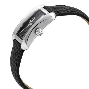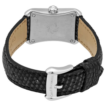 Stainless steel case with a black leather strap. Fixed stainless steel bezel. Black dial with silver-tone skeleton hands. Stylized A rabic numerals mark the 3 and 9 o' clock. Dial Type: Analog. Quartz movement. Scratch resistant sapphire crystal. Pull / push crown. Solid case back. Unique case shape. Case dimensions: 30 mm x 21 mm. Case thickness: 6.2 mm. Band width: 14 mm. Tang clasp. Water resistant at 30 meters / 100 feet. Functions: hour, minute. Alacria Mini Series. Luxury watch style. Watch label: Swiss Made. Item Variations: 366.309.8. Carl F. Bucherer Alacria Mini Ladies Watch 00.10703.08.32.01.