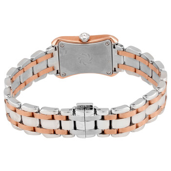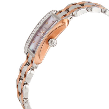 18kt rose gold case with a stainless steel bracelet with 18kt rose gold links. Fixed stainless steel bezel set with diamonds. Pink mother of pearl dial with rose gold-tone skeleton hands and index and diamond hour markers. Dial Type: Analog. Caliber CFB 1850 quartz movement. Scratch resistant sapphire crystal. Pull / push crown. Solid case back. Unique case shape. Case dimensions: 21 mm x 30 mm. Case thickness: 6.2 mm. Band width: 14 mm. Fold over clasp with a push button release. Water resistant at 30 meters / 100 feet. Functions: hour, minute. Alacria Princess Series. Luxury watch style. Watch label: Swiss Made. Carl F. Bucherer Alacria Princess Quartz Diamond Ladies Watch 00.10703.07.77.31.