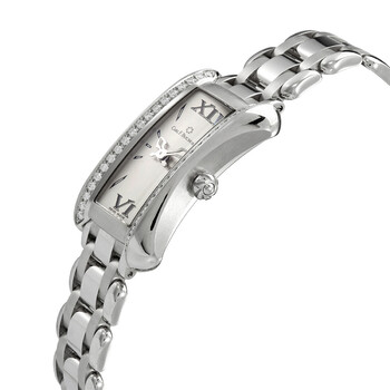 Stainless steel case with a stainless steel bracelet. Fixed stainless steel bezel set with diamonds. Silver dial with silver-tone skeleton hands and index hour markers. Roman numerasl appear at the 6 and 12 o'clock position. Dial Type: Analog. Carl F. Bucherer calibre CFB 1850 quartz movement. Scratch resistant sapphire crystal. Pull / push crown. Solid case back. Unique case shape. Case dimensions: 38 mm x 26.5 mm. Case thickness: 7.4 mm. Band width: 17 mm. Fold over clasp. Water resistant at 30 meters / 100 feet. Functions: hour, minute. Alacria Series. Luxury watch style. Watch label: Swiss Made. Item Variations: 366.335.0. Carl F. Bucherer Alacria Silver Dial Ladies Watch 00.10701.08.15.31.