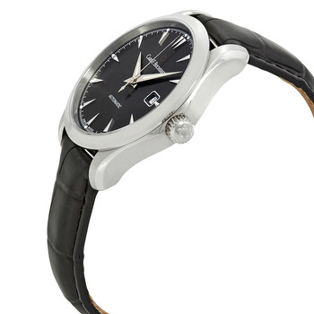 Stainless steel case with a black (alligator) leather strap. Fixed stainless steel bezel. Black dial with luminous silver-tone dauphine-style hands and index hour markers. Minute markers around the outer rim. Dial Type: Analog. Luminescent hands and markers. Date display at the 3 o'clock position. Carl F. Bucherer calibre CFB 1950 automatic movement, containing 26 Jewels, bitting at 28800 vph, and has a power reserve of approximately 38 hours. Scratch resistant anti-reflective sapphire crystal. Pull / push crown. Transparent sapphire case back. Round case shape. Case size: 42 mm. Case thickness: 11.98 mm. Band width: 20 mm. Tang clasp. Water resistant at 30 meters / 100 feet. Functions: date, hour, minute, second. Manero Autodate Series. Luxury watch style. Watch label: Swiss Made. Carl F Bucherer Manero AutoDate Automatic Black Dial Men's Watch 00.10915.08.33.01.