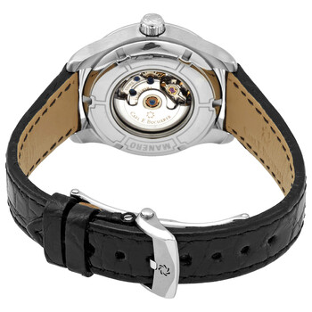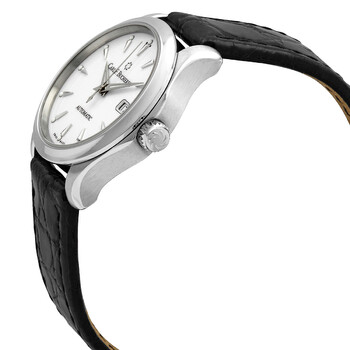 Stainless steel case with a black (alligator) leather strap. Fixed stainless steel bezel. White dial with luminous silver-tone hands and index hour markers. Dial Type: Analog. Luminescent hands and markers. Date display at the 3 o'clock position. Carl F. Bucherer calibre CFB 1963 automatic movement with a 38-hour power reserve. Scratch resistant sapphire crystal. Pull / push crown. Transparent case back. Round case shape. Case size: 30 mm. Case thickness: 9.54 mm. Band width: 14 mm. Tang clasp. Water resistant at 30 meters / 100 feet. Functions: date, hour, minute, second. Manero Series. Luxury watch style. Watch label: Swiss Made. Item Variations: 366.570.9. Carl F. Bucherer Manero Automatic Ladies Watch 00.10911.08.23.01.