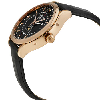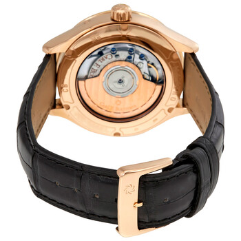 18kt rose gold case with a black (alligator) leather strap. Fixed 18kt rose gold bezel. Black dial with luminous rose gold-tone hands and index hour markers. Date scale (pointer date). Minute markers around the outer rim. Dial Type: Analog. Luminescent hands and markers. Day of the week and month display above center dial. One subdial displaying: moonphase. Carl F. Bucherer Calibre CFB 1966 Automatic movement, containing 21 Jewels, bitting at 28800 vph, and has a power reserve of approximately 42 hours. Scratch resistant sapphire crystal. Transparent case back. Round case shape, case size: 38 mm, case thickness: 10.85 mm. Band width: 16 mm / 18 mm. Tang clasp. Water resistant at 30 meters / 100 feet. Functions: date, day, hour, minute, second, month, moonphase. Manero Series. Luxury watch style. Watch label: Swiss Made. Item Variations: 169.031.3. Carl F. Bucherer Manero Automatic Men's Watch 00.10909.03.33.01.