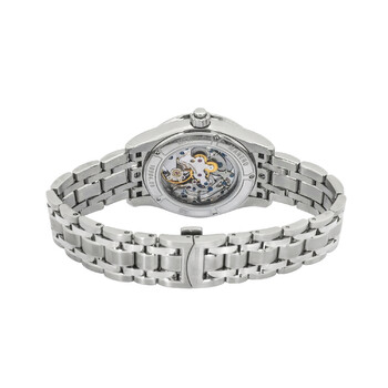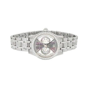 Stainless steel case with a stainless steel bracelet. Fixed stainless steel bezel set with diamonds. Mother of pearl dial with silver-tone arrow-shaped hands and index hour markers. An Arabic numeral appears at the 6 o'clock position. Arabic numeral minute markers (at 5 minute intervals). Minute markers around the outer rim. Dial Type: Analog. Chronograph - two sub-dials displaying: 60 second and 30 minute. Carl F. Bucherer calibre CFB 1962 automatic movement with a 42-hour power reserve. Scratch resistant sapphire crystal. Pull / push crown. Transparent case back. Round case shape. Case size: 35 mm. Case thickness: 11 mm. Fold over clasp with a push button release. Water resistant at 30 meters / 100 feet. Functions: chronograph, monopoussoir, hour, minute, second. Manero Series. Luxury watch style. Watch label: Swiss Made. Item Variations: 366.515.2. Carl F. Bucherer Manero Chronograph Manual Winding Ladies Watch 00.10904.08.86.31.