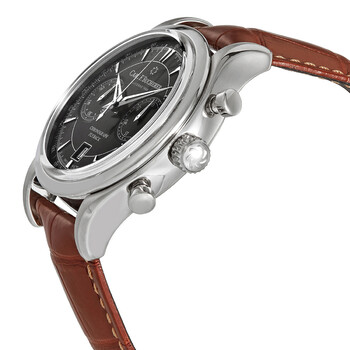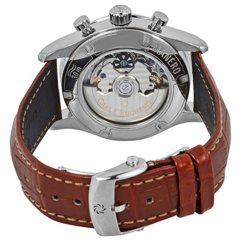 Stainless steel case with a dark brown (alligator) leather strap. Fixed stainless steel bezel. Black dial with index hour markers. Minute markers. Tachymeter markings around the outer rim. Dial Type: Analog. Date display at the 6 o'clock position. Chronograph - two sub-dials displaying: 60 second and 30 minute. CFB1970 automatic movement with a 42-hour power reserve. Scratch resistant sapphire crystal. Pull / push crown. Transparent case back. Round case shape, case size: 43 mm, case thickness: 14 mm. Folding tang clasp. Water resistant at 30 meters / 100 feet. Functions: calendar, chronograph, tachymeter, date, hour, minute, second. Manero Series. Dress watch style. Carl F. Bucherer Manero Chronograph Black Dial Unisex Watch 00.10919.08.33.01.