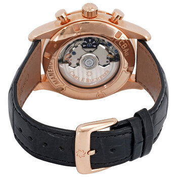 18kt rose gold case with a black (alligator) leather strap. Fixed 18kt rose gold bezel. Black dial with rose gold-tone hands and index hour markers. Minute markers. Tachymeter markings around the outer rim. Dial Type: Analog. Date display at the 6 o'clock position. Chronograph - two sub-dials displaying: 60 second and 30 minute. Carl F. Bucherer calibre CFB 1970 automatic movement, based upon ETA 7750, containing 25 Jewels, bitting at 28800 vph, and has a power reserve of approximately 42 hours. Scratch resistant sapphire crystal. Transparent case back. Round case shape. Case size: 43 mm. Case thickness: 14.5 mm. Band width: 20mm. Tang clasp. Water resistant at 30 meters / 100 feet. Functions: chronograph, tachymeter, date, hour, minute, second. Manero Flyback Series. Luxury watch style. Watch label: Swiss Made. Carl F. Bucherer Manero Flyback Chronograph Automatic Black Dial Men's Watch 00.10919.03.33.01.