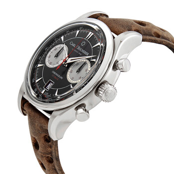 Stainless steel case with a brown (kudu) leather strap. Fixed stainless steel bezel. Black dial with silver-tone hands and index hour markers. Minute markers. Tachymeter markings around the outer rim. Dial Type: Analog. Date display at the 6 o'clock position. Chronograph - two silver sub-dials displaying: 60 second and 30 minute. Carl F. Bucherer calibre CFB 1970 automatic movement, based upon ETA 7750, containing 25 Jewels, bitting at 28800 vph, and has a power reserve of approximately 42 hours. Scratch resistant sapphire crystal. Transparent case back. Round case shape. Case size: 43 mm. Case thickness: 14.45 nn. Fold over clasp. Water resistant at 30 meters / 100 feet. Functions: chronograph, tachymeter, date, hour, minute, second. Manero Flyback Series. Luxury watch style. Watch label: Swiss Made. Carl F. Bucherer Manero Flyback Chronograph Automatic Black Dial Men's Watch 00.10919.08.33.02.