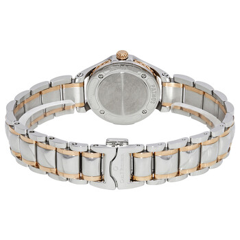 Stainless steel case with a stainless steel bracelet with 18kt rose gold links. Fixed stainless steel bezel set with diamonds. Silver dial with rose gold-tone skeleton hands and index hour markers. Arabic numerals mark the 3, 6, 9 and 12 o'clock positions. Minute markers around the outer rim. Dial Type: Analog. Caliber CFB 1855 quartz movement. Scratch resistant sapphire crystal. Pull / push crown. Solid case back. Round case shape. Case size: 25 mm. Case thickness: 6.94 mm. Fold over clasp with a push button release. Water resistant at 30 meters / 100 feet. Functions: hour, minute. Luxury watch style. Watch label: Swiss Made. Carl F. Bucherer Pathos Princess Diamond Silver Dial Ladies Watch 00.10521.07.26.31.