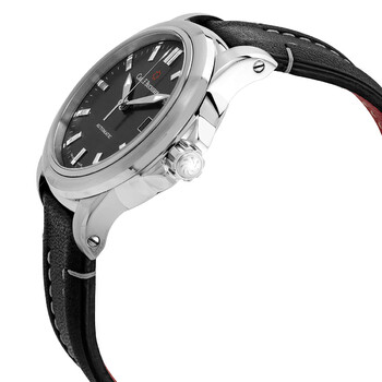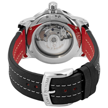 Silver-tone stainless steel case with a black leather strap. Fixed silver-tone stainless steel bezel. Black dial with luminous silver-tone hands and index hour markers. Minute markers around the outer rim. Dial Type: Analog. Luminescent hands and markers. Date display at the 3 o'clock position. Carl F. Bucherer Calibre CFB 1950 Automatic movement, containing 26 Jewels, bitting at 28800 vph, and has a power reserve of approximately 38 hours. Scratch resistant sapphire crystal. Screw down crown. Transparent case back. Round case shape, case size: 38 mm, case thickness: 11 mm. Band width: 19 mm. Tang clasp. Water resistant at 50 meters / 165 feet. Functions: date, hour, minute, second. Patravi Series. Luxury watch style. Watch label: Swiss Made. Item Variations: 166.117.6. Carl F. Bucherer Patravi Automatic Black Dial Men's Watch 00.10617.08.33.01.