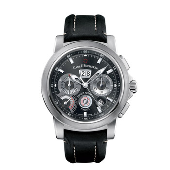 Silver-tone stainless steel case with a black leather strap. Fixed silver-tone stainless steel bezel. Black dial with silver-tone skeleton sword-shaped hands and index hour markers. Minute markers around the outer rim. Dial Type: Analog. Luminescent hands. Date display at the 12 o'clock position. Four sub-dials displaying: 60 seconds, 30 minutes, power reserve, flyback chronograph. Carl F. Bucherer Calibre CFB 1902 automatic movement with a 42-hour power reserve. Scratch resistant sapphire crystal. Screw down crown. Skeleton transparent exhibition see through case back. Round case shape, case size: 44.6 mm, case thickness: 14.1 mm. Water resistant at 50 meters / 165 feet. Functions: annual calendar, chronograph, flyback, month, big date, hour, minute, small second, power reserve indicator. Patravi Series. Luxury watch style. Watch label: Swiss Made. Item Variations: 166.160.9. Carl F. Bucherer Patravi Automatic Men's Watch 00.10623.08.33.01.