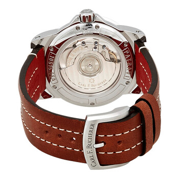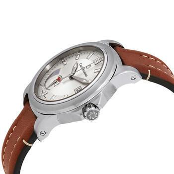 Stainless steel case with a brown leather strap. Fixed bezel. Silver dial with silver-tone hands and index hour markers. Dial Type: Analog. Luminescent hands and markers. Date display at the 3 o'clock position. One- power reserve. Carl F. Bucherer Calibre CFB 1961 automatic movement with about 42 hours of power reserve. Scratch resistant sapphire crystal. Screw down crown. Case size: 38 mm. Round case shape. Functions: date, hour, minute, second, power reserve. Luxury watch style. Watch label: Swiss Made. Item Variations: 166.141.6. Carl F. Bucherer Patravi Automatic Power Reserve Men's Watch 00.10616.08.13.01.