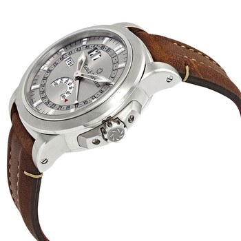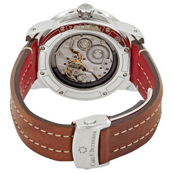 Silver-tone stainless steel case with a brown leather strap. Fixed stainless steel bezel. Silver dial with silver-tone hands and index hour markers. Dial Type: Analog. Date display at the 11 o'clock position. Carl F. Bucherer Calibre CFB A1004 automatic movement with a 55-hour power reserve. Scratch resistant sapphire crystal. Round case shape, case size: 42.6 mm, case thickness: 12.85 mm. Water resistant at 50 meters / 165 feet. Functions: date, hour, minute, second, week indication. Luxury watch style. Watch label: Swiss Made. Carl F. Bucherer Patravi Calendar Automatic Silver Dial Men's Leather Watch 00.10629.08.63.01.