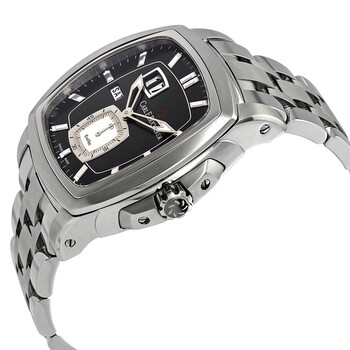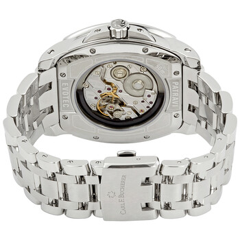 Silver-tone stainless steel case with a silver-tone stainless steel bracelet. Fixed silver-tone stainless steel bezel. Black dial with silver-tone skeleton sword-shaped hands and index hour markers. Minute markers around the outer rim. Dial Type: Analog. Luminescent hands and markers. Date display between 10 and 11 o'clock position. One subdial displaying: small second. Carl F. Bucherer Calibre CFB A1001 Automatic movement, containing 31 Jewels, bitting at 21600 vph, and has a power reserve of approximately 55 hours. Scratch resistant sapphire crystal. Screw down crown. Transparent see through case back. Cushion case shape, case size: 44.5 mm x 43.75 mm, case thickness: 13.95 mm. Fold over clasp. Water resistant at 50 meters / 165 feet. Functions: big date, day, hour, minute, small second. Patravi Evotec Series. Luxury watch style. Watch label: Swiss Made. Item Variations: 166.455.1. Carl F. Bucherer Patravi EvoTec Automatic Men's Watch 00.10625.08.33.21.