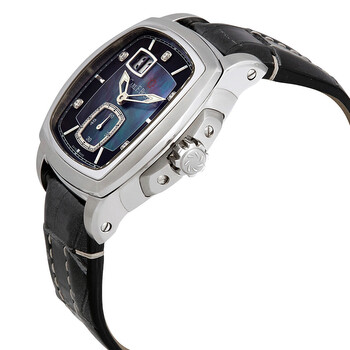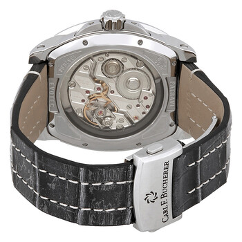 Stainless steel case with a black leather strap. Fixed stainless steel bezel. Mother of pearl and black dial with luminous silver-tone hands and alternating index and diamond hour markers. Minute markers around the outer rim. Dial Type: Analog. Luminescent hands and markers. Date display at the 11 o'clock position. 60 seconds sub-dial. Carl F. Bucherer calibre CFB A1003 automatic movement with a 55-hour power reserve. Scratch resistant sapphire crystal. Screw down crown. Transparent case back. Cushion case shape. Case dimensions: 39.25 mm x 38.54 mm. Case thickness: 12.9 mm. Deployment clasp. Water resistant at 50 meters / 165 feet. Functions: date, hour, minute, second. Luxury watch style. Watch label: Swiss Made. Item Variations: 166.466.4. Carl F. Bucherer Patravi EvoTec Automatic Men's Watch 00.10628.08.87.01.