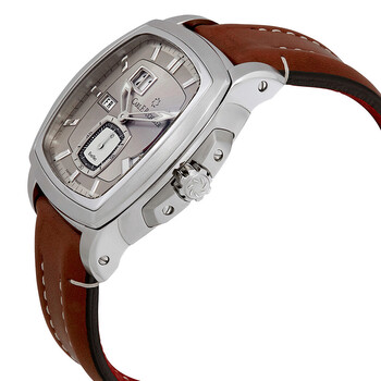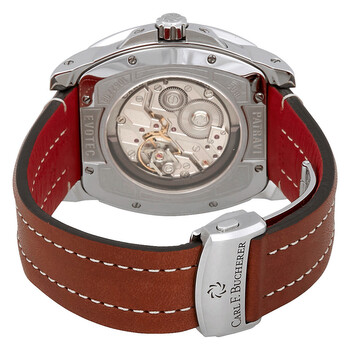 Silver-tone stainless steel case with a brown leather strap. Fixed silver-tone stainless steel bezel. Rhodium dial with silver-tone hands and index hour markers. Minute markers around the outer rim. Dial Type: Analog. Luminescent hands and markers. Date display between 10 and 11 o'clock position. Two sub-dials displaying: small second and power reserve indicator. Carl F. Bucherer Calibre CFB A1002 Automatic movement, based upon CFB A1000, containing 33 Jewels, bitting at 21600 vph, and has a power reserve of approximately 55 hours. Scratch resistant sapphire crystal. Screw down crown. Transparent see through case back. Cushion case shape, case size: 44.5 mm x 43.75 mm, case thickness: 13.95 mm. Deployment clasp. Water resistant at 50 meters / 165 feet. Functions: big date, day, hour, minute, small second, power reserve indicator. Patravi Evotec Series. Luxury watch style. Watch label: Swiss Made. Item Variations: 166.411.9. Carl F. Bucherer Patravi EvoTec Power Reserve Automatic Men's Watch 00.10627.08.63.01.