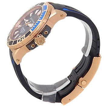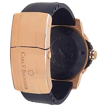 18kt rose gold case with a black rubber strap. Uni-directional rotating black and blue (Batman) ceramic bezel. Black dial with rose gold-tone hands and index hour markers. Minute markers around the outer rim. Dial Type: Analog. Luminescent hands and markers. Date display at the 3 o'clock position. Carl F. Bucherer Calibre CFB 1950.1 automatic movement with a 38-hour power reserve. Scratch resistant sapphire crystal. Screw down crown. Round case shape, case size: 44.6 mm, case thickness: 13.45 mm. Water resistant at 500 meters / 1650 feet. Functions: date, hour, minute, second, chronometer. Luxury watch style. Watch label: Swiss Made. Item Variations: 169.155.4. Carl F. Bucherer Patravi ScubaTec Chronograph Automatic Men's Watch 00.10632.22.33.01.