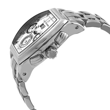 Silver-tone stainless steel case and bracelet. Fixed silver-tone stainless steel bezel. Silver dial with luminous silver-tone hands and index hour markers. Minute markers around the outer rim. Dial Type: Analog. Luminescent hands and markers. Date display above center dial. Two sub-dials displaying: 60 second and 30 minute. power reserve indicator. Carl F. Bucherer Calibre CFB 1960 automatic movement with a 42-hour power reserve. Scratch resistant sapphire crystal. Screw down crown. Solid case back. Tonneau case shape, case size: 42 mm x 39 mm, case thickness: 13.8 mm. Fold over clasp with a safety release. Water resistant at 50 meters / 165 feet. Functions: chronograph, big date, hour, minute, second, power reserve indicator, day/night indicator. Patravi T-graph Series. Luxury watch style. Watch label: Swiss Made. Item Variations: 166.114.3. Carl F. Bucherer Patravi T-Graph Chronograph Automatic Men's Watch 00.10615.08.13.21.