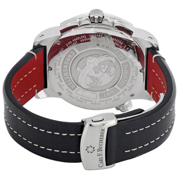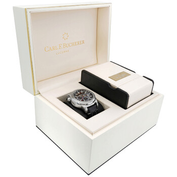 Silver-tone stainless steel case with a black leather strap. Fixed silver-tone stainless steel bezel. Black dial with silver-tone hands and index hour markers. Gmt markers around the outer rim. Dial Type: Analog. Luminescent hands and markers. Date display between 4 and 5 o'clock position. Chronograph - three sub-dials displaying: 60 seconds, 30 minutes, 12 hours. Carl F. Bucherer Calibre CFB 1901.1 Automatic movement, based upon ETA 2894, containing 39 Jewels, bitting at 28800 vph, and has a power reserve of approximately 42 hours. Scratch resistant sapphire crystal. Screw down crown. Skeleton transparent exhibition see through case back. Round case shape, case size: 46.6 mm, case thickness: 15 mm. Water resistant at 50 meters / 165 feet. Functions: chronograph, date, GMT, second time zone, hour, minute, small second, chronometer. Patravi Traveltec Series. Luxury watch style. Watch label: Swiss Made. Item Variations: 166.200.0. Carl F. Bucherer Patravi Traveltec Chronograph Automatic Men's Watch 00.10620.08.33.01.