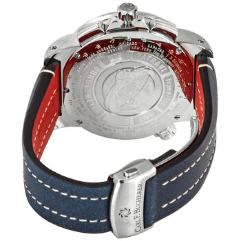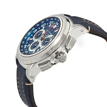 Stainless steel case with a blue (calfskin) leather strap. Fixed stainless steel bezel. Blue dial with silver-tone hands and index hour markers. Minute markers. (Rotating) 24 hour (GMT) markers around the outer rim. Dial Type: Analog. Luminescent hands and markers. Date display between the 4 and 5 o'clock positions. Chronograph - three sub-dials displaying: 60 second, 30 minute and 12 hour. Carl F. Bucherer calibre CFB 1901.1 automatic movement, based upon ETA 2894, containing 39 Jewels, bitting at 28800 vph, and has a power reserve of approximately 42 hours. Scratch resistant sapphire crystal. Screw down crown. Transparent case back. Round case shape. Case size: 46.6 mm. Case thickness: 16 mm. Band width: 20 mm / 23 mm. Fold over clasp. Water resistant at 50 meters / 165 feet. Functions: chronograph, date, GMT, second time zone, hour, minute, small second, chronometer. Patravi Traveltec Series. Luxury watch style. Watch label: Swiss Made. Item Variations: 166.203.3. Carl F. Bucherer Patravi TravelTec Chronograph Automatic Men's Watch 00.10620.08.53.01.