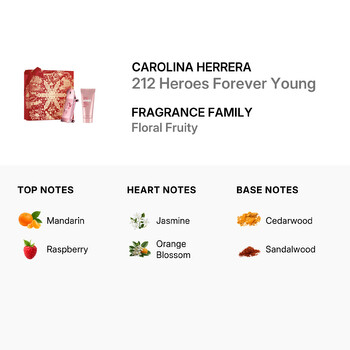 The 212 Heroes Forever Young Gift Set is the perfect choice for those who love to indulge in a signature scent. This exclusive set includes a 2.7 oz Eau de Parfum and a 3.4 oz Body Lotion, beautifully presented in a stylish pink tin—making it an ideal gift for any occasion.